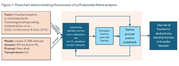 We then applied Meta’s Llama-3 language model to replicate this analysis. Following a framework for LLM-assisted content analysis developed by Chew et al. (2023), we iteratively refined the prompt, ran the model, qualitatively compared its results to our manually identified frames, and adjusted the prompt as needed (see Figure 1).